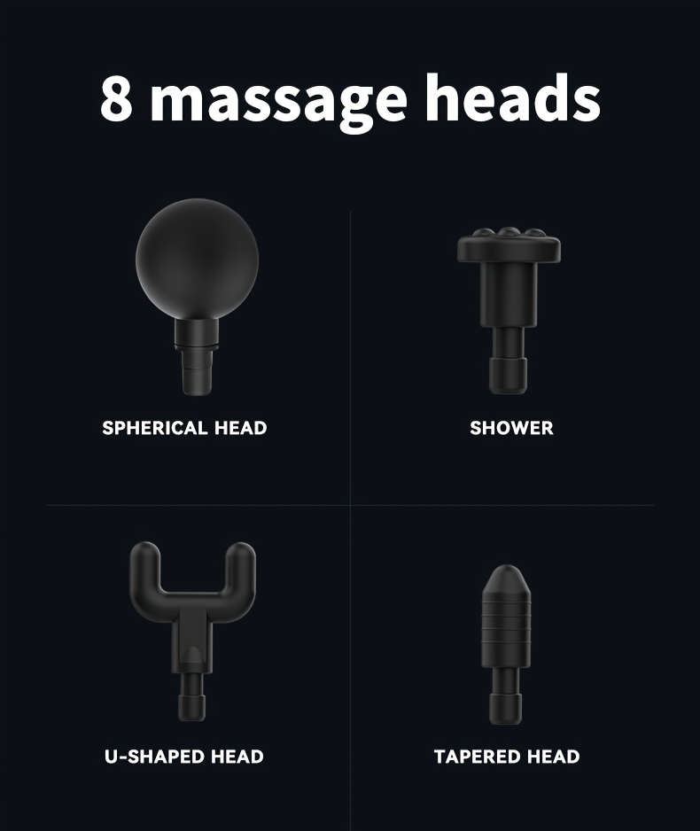 - 8 interchangeable heads – designed for different muscle groups and body areas.